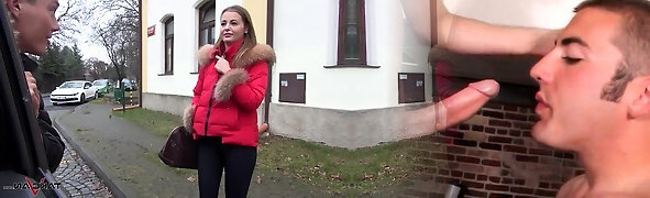 Bright looking in her red jacket mega-bitch Candy is picked up for car sex