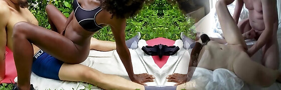 Outdoor sporty bang-out with curly ebony beauty
