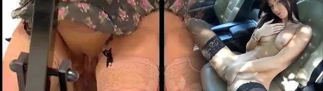 Stunning young hottie Sabrisse is playing with melons and gash in the car