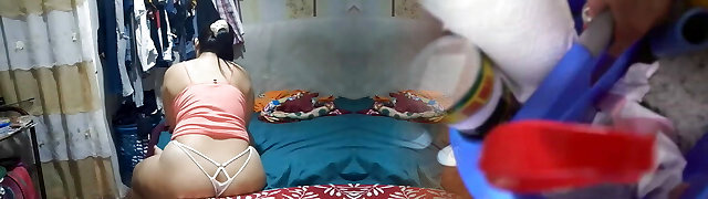 I record my stepsister while she tidies up the bedroom, what a cute rump she has, I want to fuck her