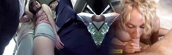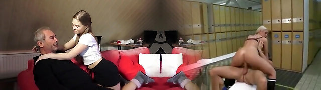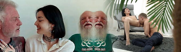 Frisky brunette doesn't mind having intercourse with two elderly perverts