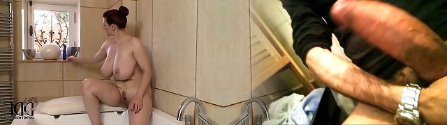 Well stacked brunette milf fake penis screws her cleavage in the bath room
