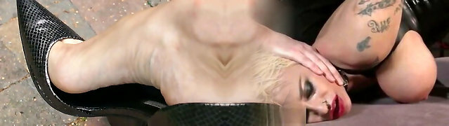 Lewd light haired MILF with yam-sized rack gets rid of heels to flash soles