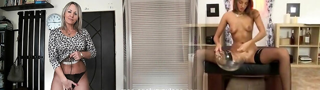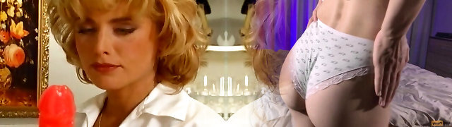 Blonde Milf flashing wanking in sheer nylon retro suspenders
