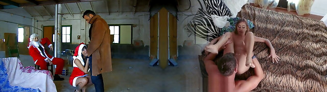 Threeway – girl in Xmas clothes fucks voyeur stranger