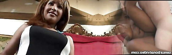 Naughty brunette strip teases then deep throats and takes humungous hard-on