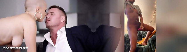 Hairy bald guy gets a blowjob and titty fuck from a handsome young black lady
