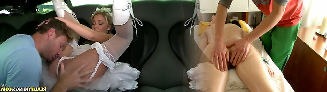 Redhead young white chick seduced and fucked in threesome action