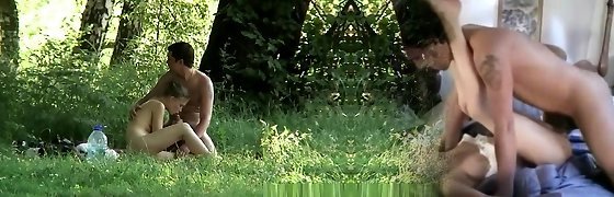 A dude jerks off while watching a couple fucking outdoors