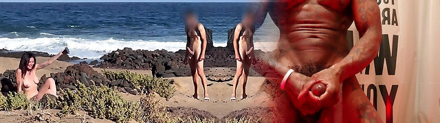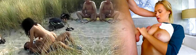 BEACH Spunk-pump FLASH. Two girls spy me and give me an hand-job.