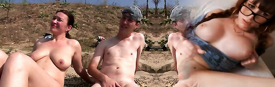 Skinny blonde cougar fucks on a nudist beach with 2 guys