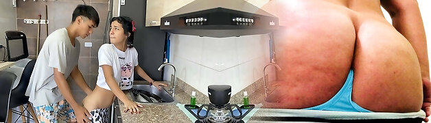 My lil stepsister asks me to fuck her for the first time in the kitchen and come inside me.