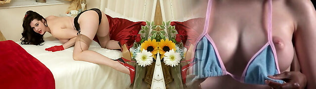 Hot busty Cougar wanks in lace mittens high heels and nylons