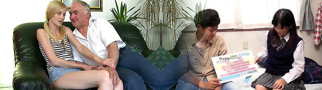 Skinny blondie in jeans miniskirt is tempted by a naughty grandpa