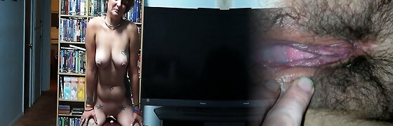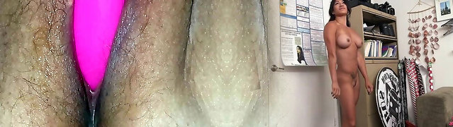 Warm brunette having a bald pussy fucked hard and long by a artificial dick