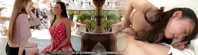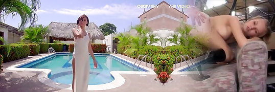 Step-mother and teen scissoring poolside