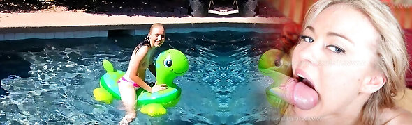 Busty nubile blows to pop balloons outside in pool
