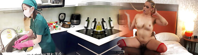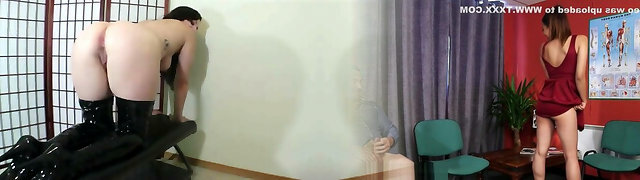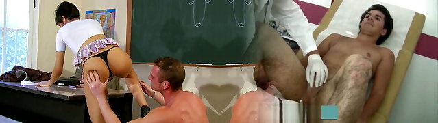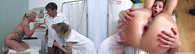 The nurse lady is tucked into her body from behind by the therapist and finishes off inside the ass