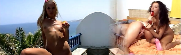 Lesbian girlfriends have fun with their favorite sex toys on the couch