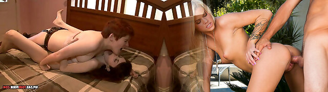 A gorgeous busty girl very first has sex with her boyfriend in bed and then she bangs with another hottie with strapon