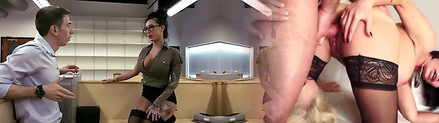Steamy girl in nice stockings comes to a tattoo master and gets banged as a bonus