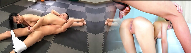 Naked wrestling ! hot girl defeats dude with a rough handjob to finish him !